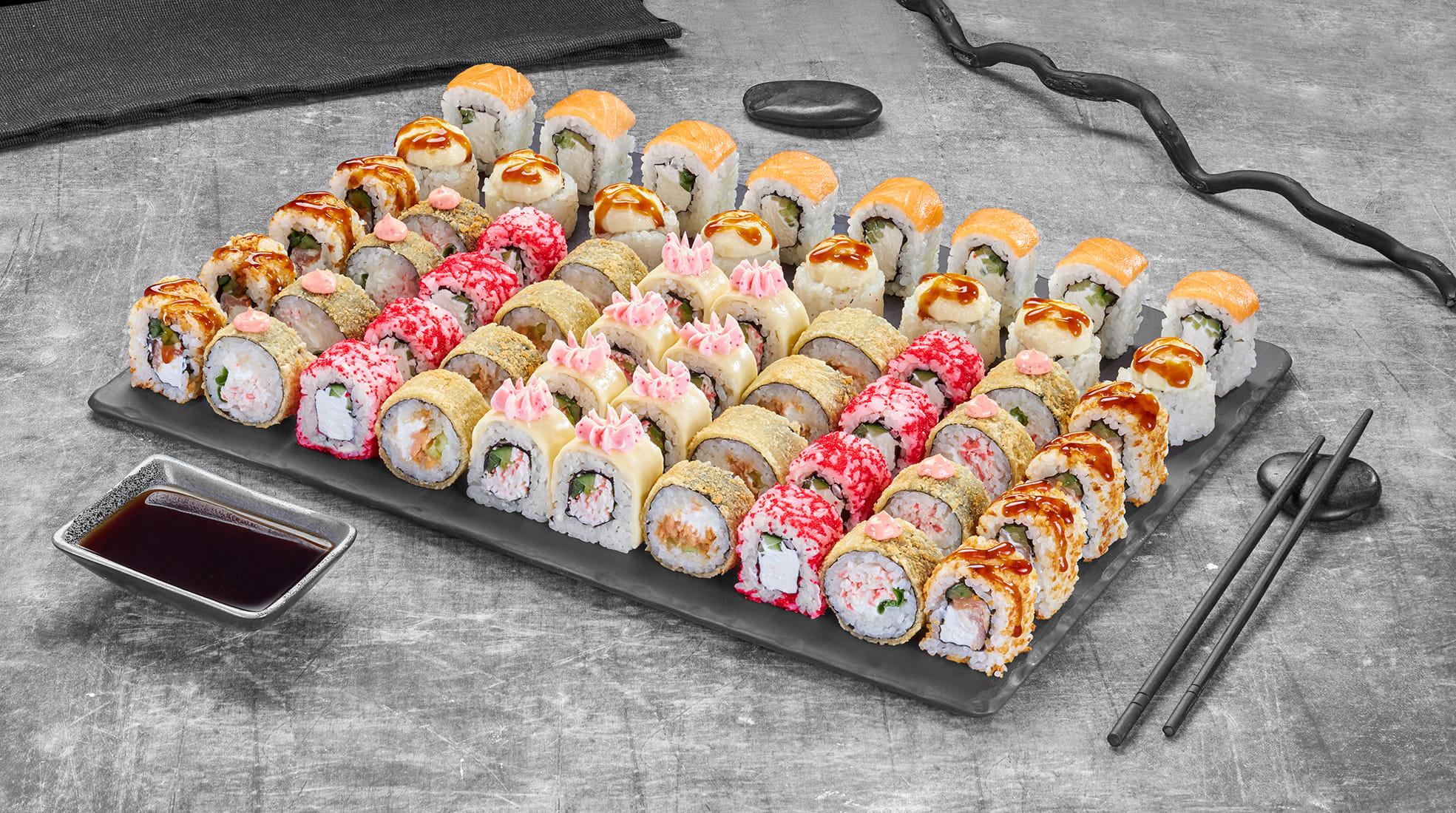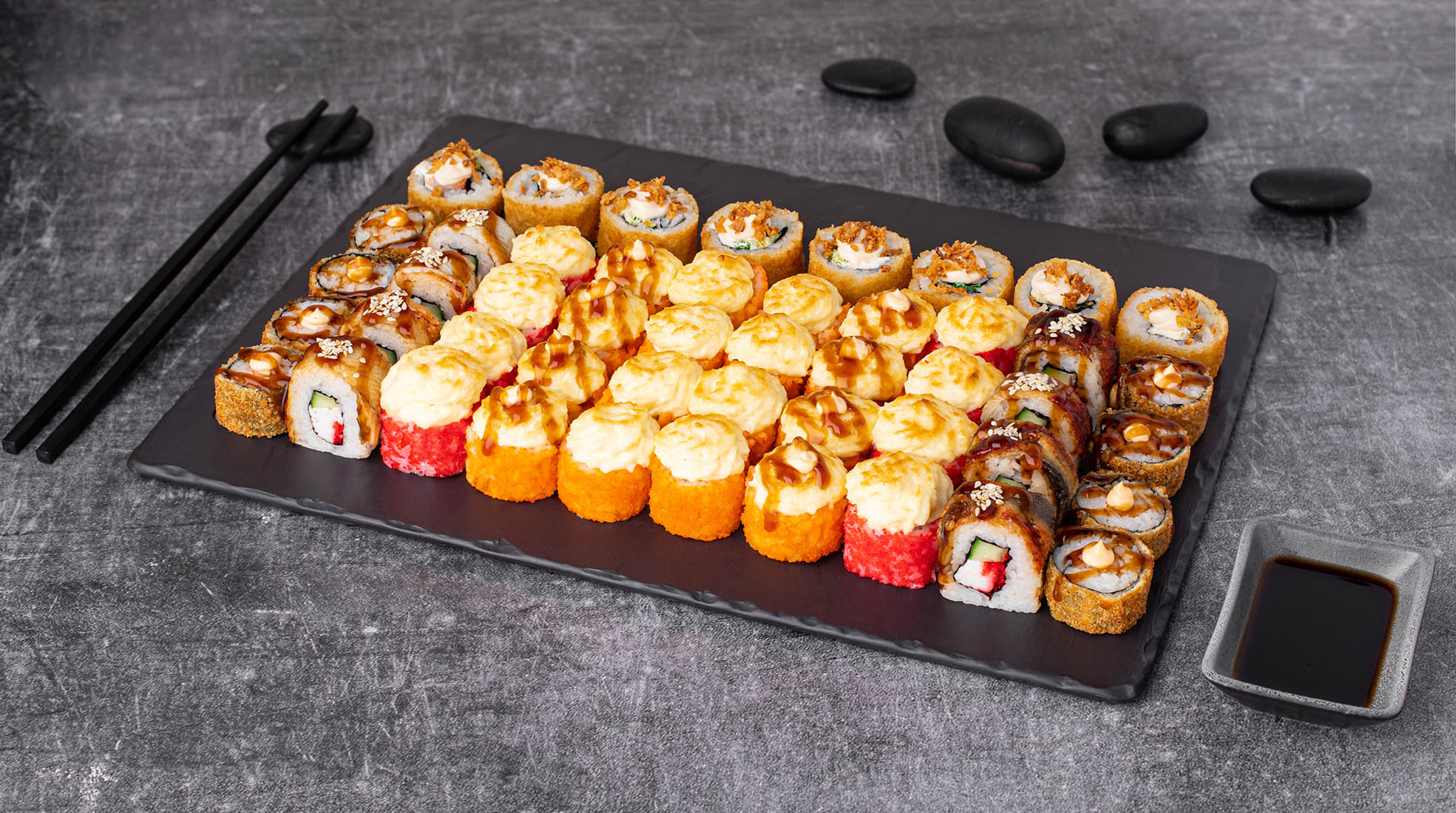 Лава с крабом 8шт, Дон бекон 8шт, Калифорния каппа маки с икрой 8шт, Куритос 8шт, Филадельфия лайт сяке 8шт, Лава с лососем 8шт, Нежный с курицей запеченный 8шт, Краб фри темпура 8шт, Сакура темпура 8шт, Калифорния темпура 8шт.