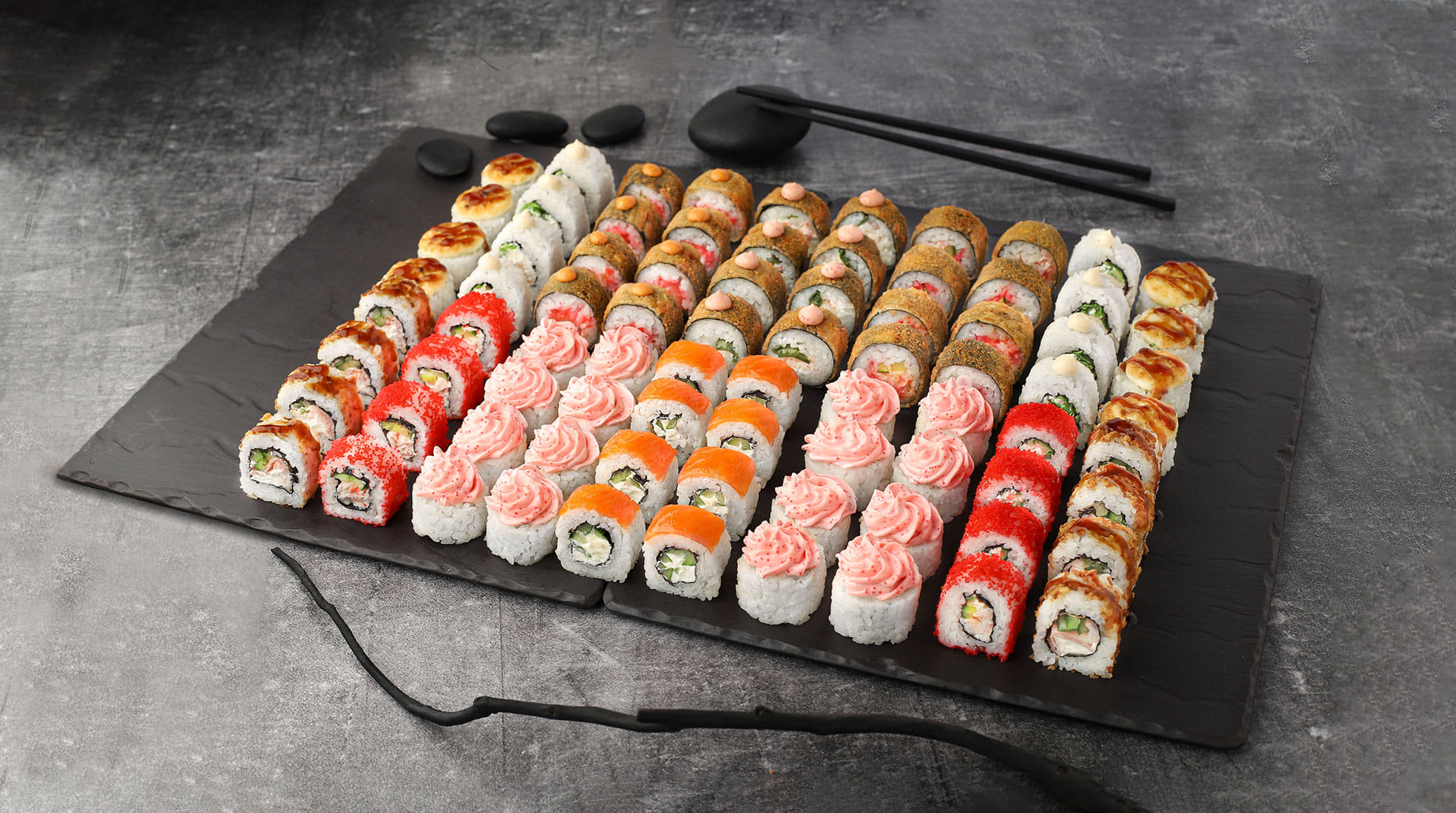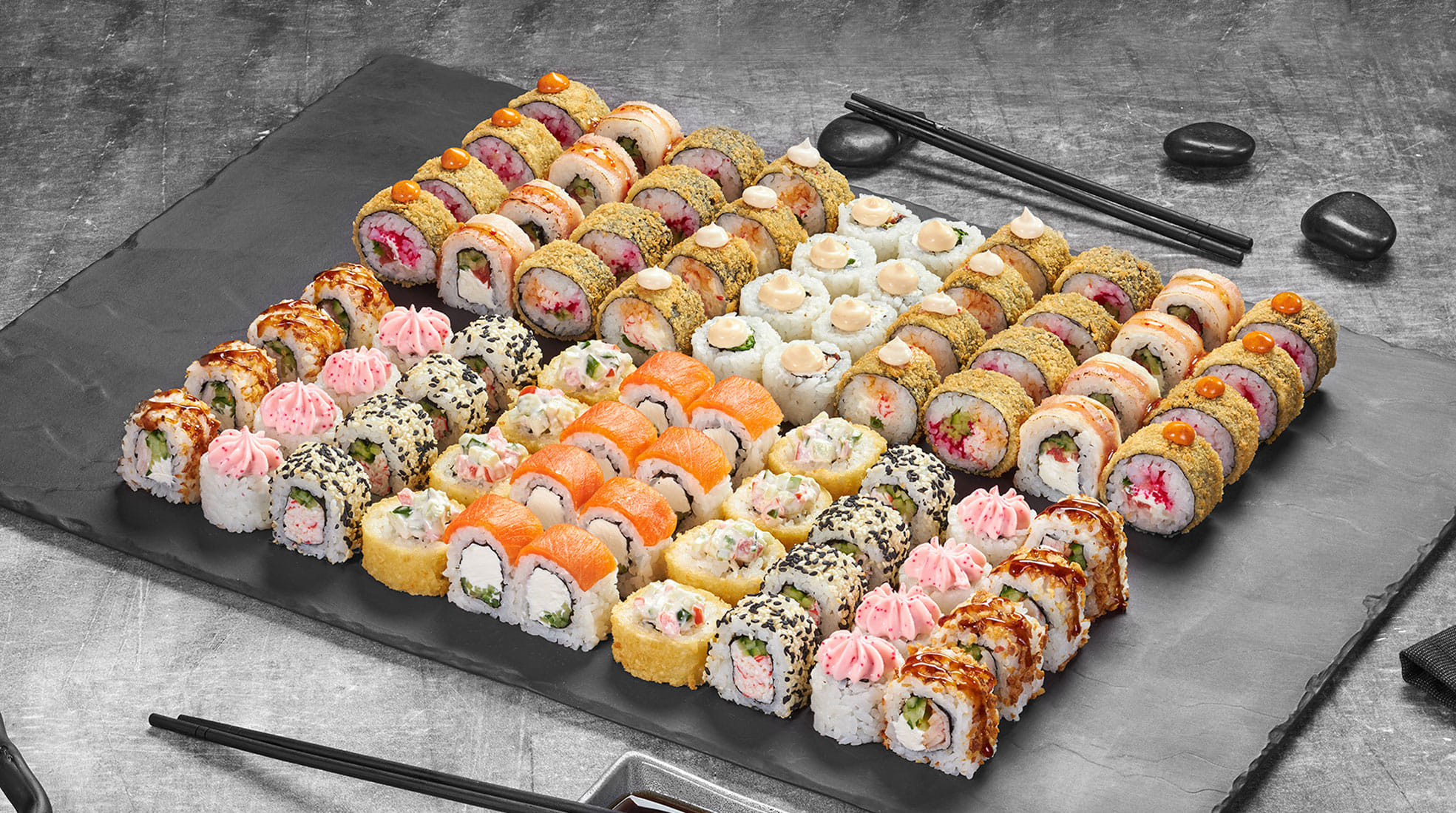 Филадельфия лайт сяке 8шт, Калифорния каппа маки в кунжуте 8шт, Лава с лососем 8 шт, Оливье темпура 8шт, Куритос 8 шт, Крабстер 8 шт, Дон бекон 8шт, Калифорния темпура 8шт, Сакура темпура 8 шт, Айролл 8 шт. Вес 2170гр. 80 шт.