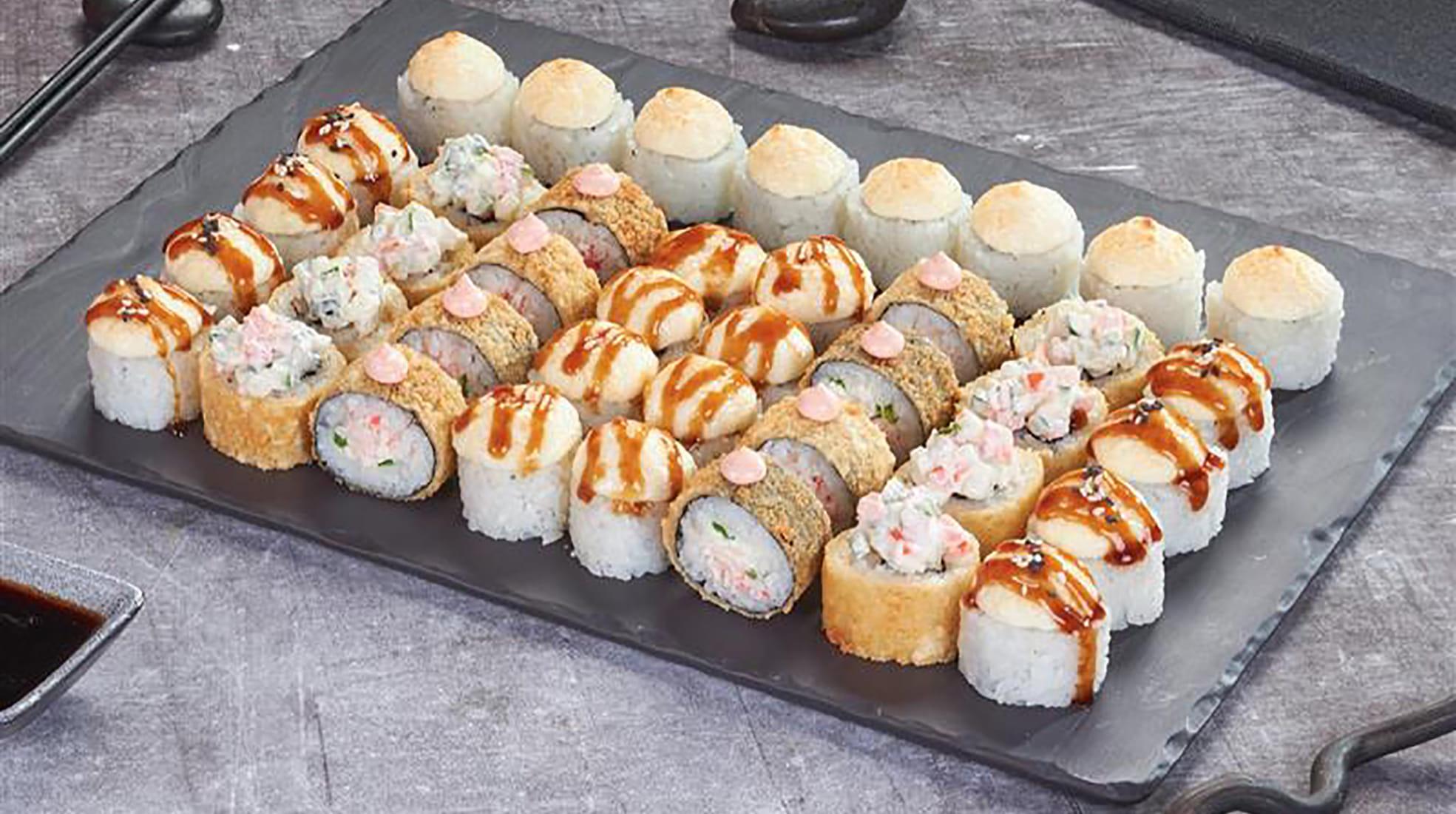 Чикен спайси запеченный 8шт, Монако запеченный 8шт, Айролл 8шт, Мидори хот 8шт, Цезарь ролл запеченный 8шт. Вес: 1135гр. 40шт.