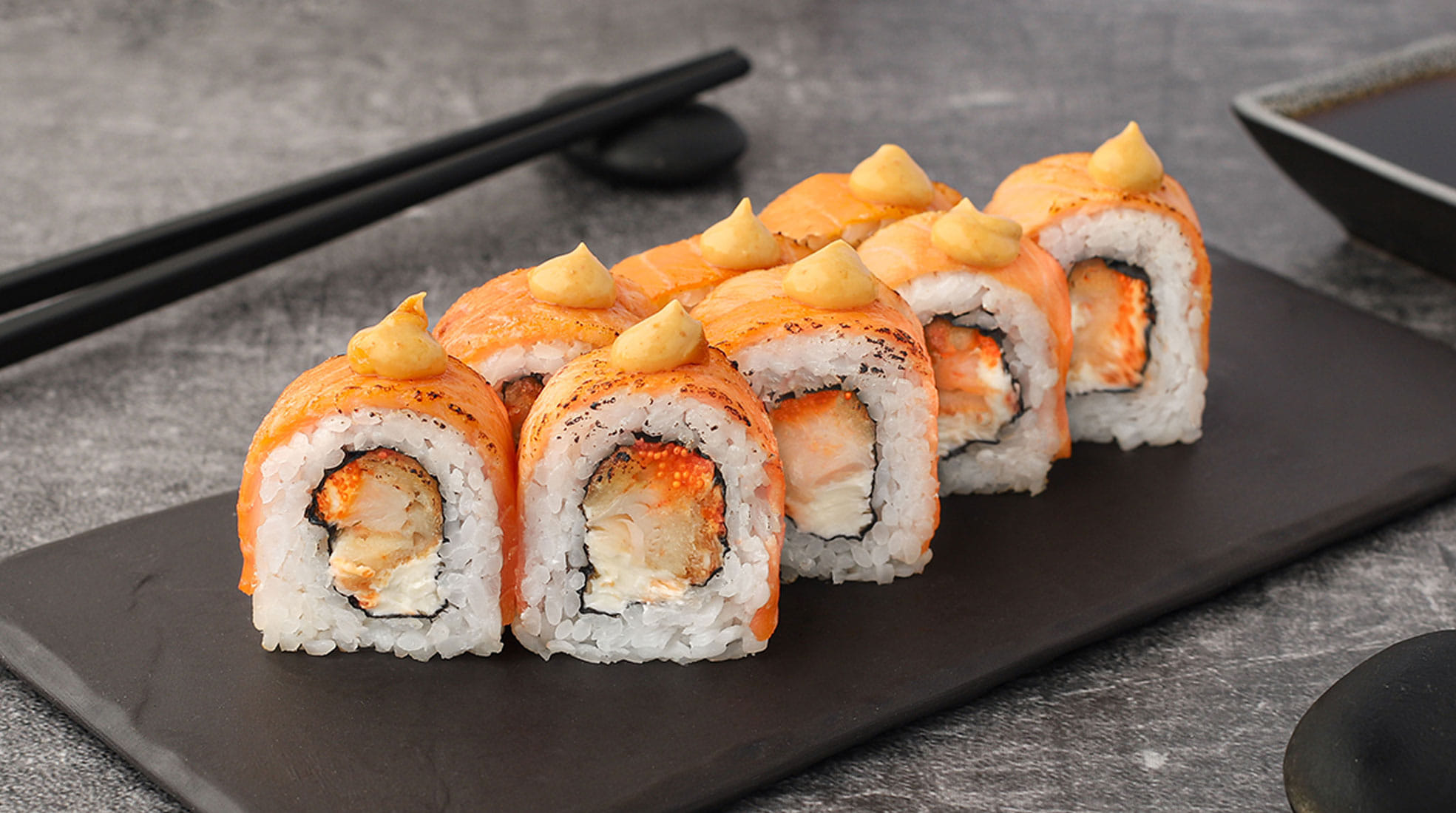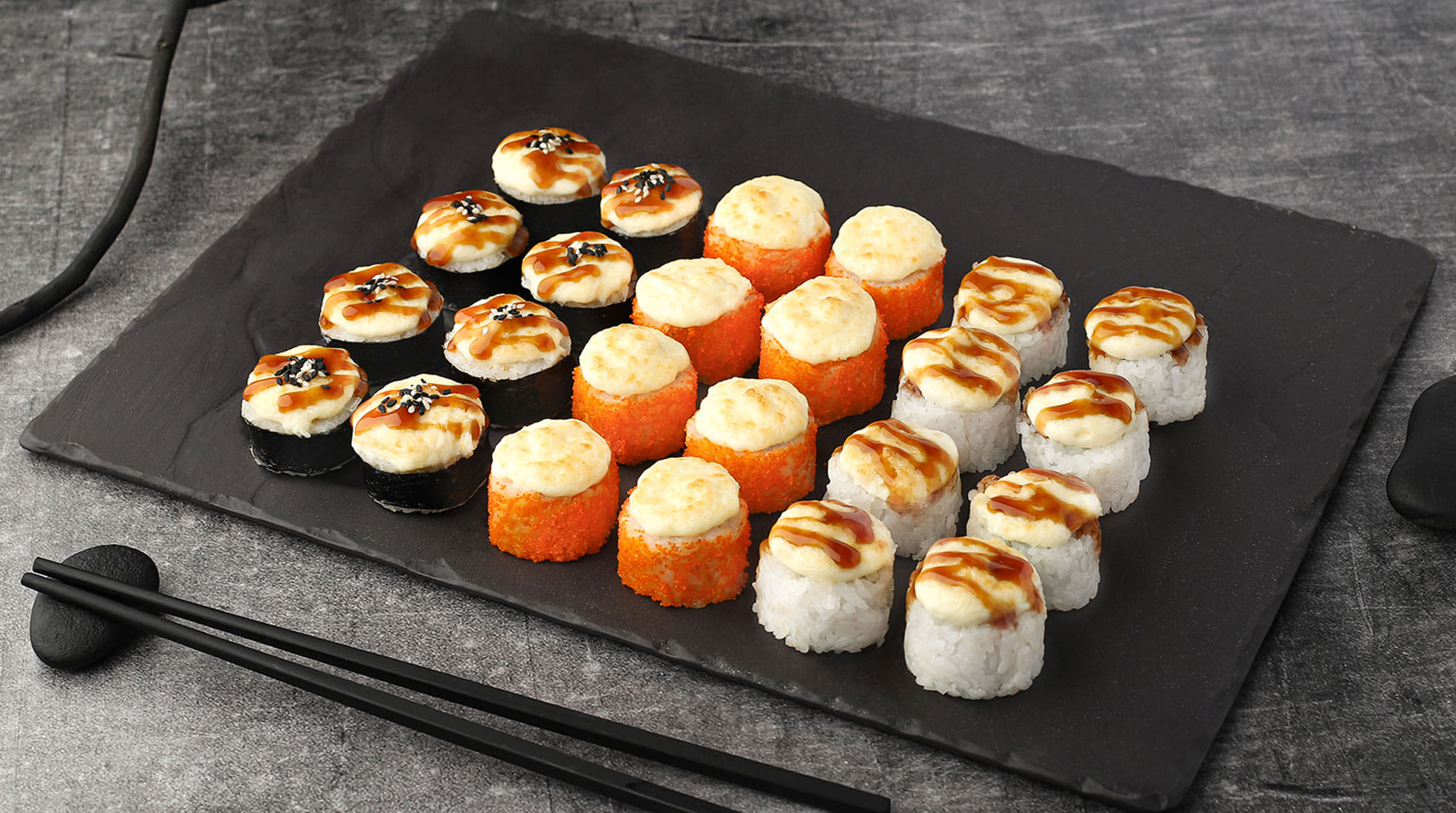 Запеченный ролл с острым лососем 8шт, Нежный с лососем запеченный 8шт, Монако запеченный 8шт.