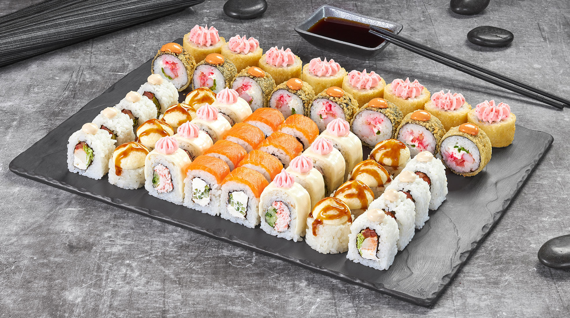 Дон Бекон 8 шт, Филадельфия лайт сяке 8 шт, Калифорния каппа маки с икрой 8 шт, Чеддер 8 шт, Краб фри темпура 8 шт, Нежный с курицей 8 шт, Филадельфия темпура 8 шт. Вес: 1530гр. 56шт.