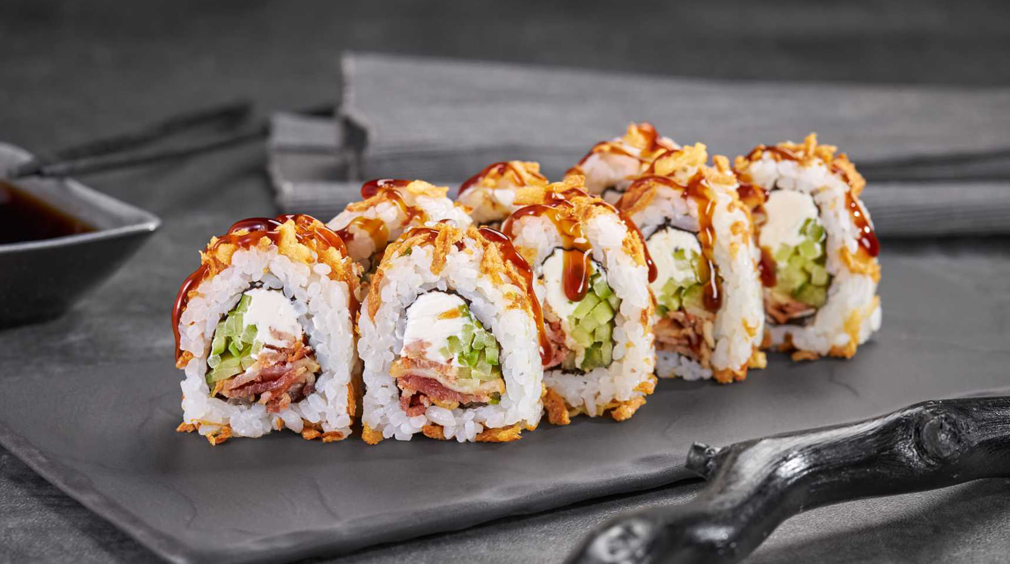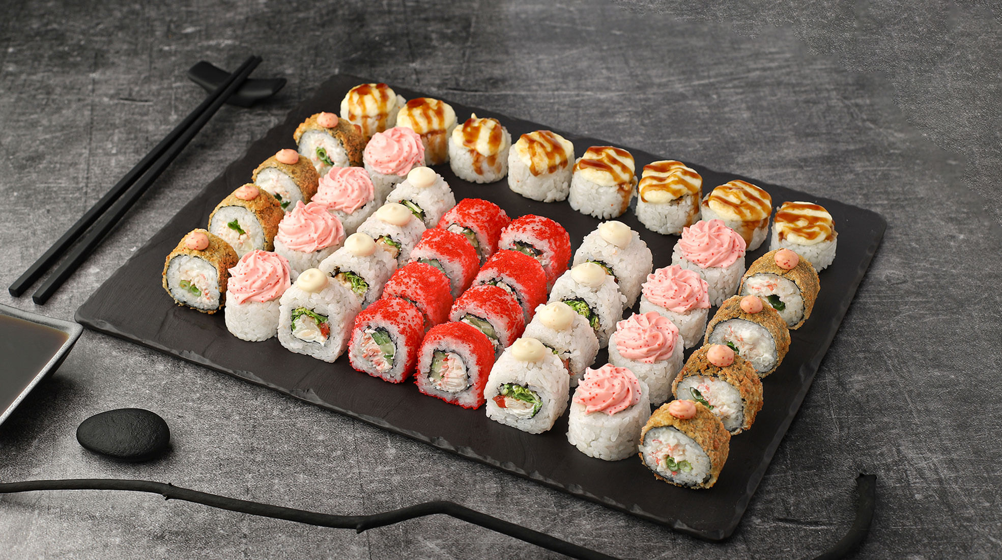 Канадский 8шт, Филадельфия Эби в кунжуте 8шт, Калифорния каппа маки с икрой 8шт, Токио 8шт, Филадельфия темпура 8шт.
