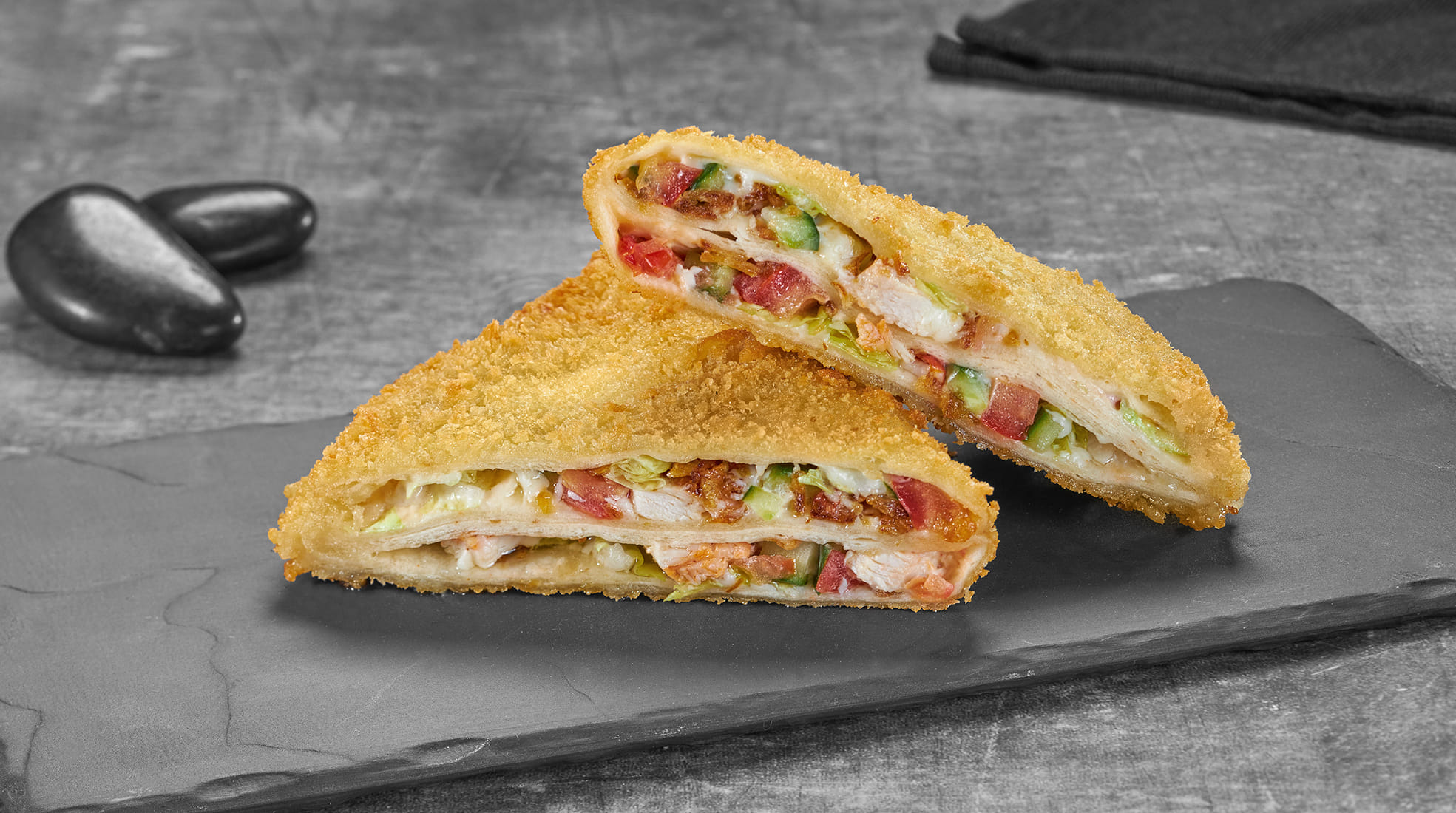 Курица, сыр моцарелла, огурец, помидор, капуста пекинская, лук фри, тортилья, соус майонезный, кляр, сухари панко
