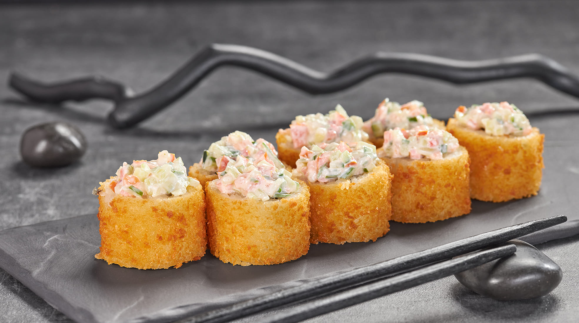 Оливье темпура 8 шт, Краб фри темпура 8 шт, Горячая Креветка 8 шт, Нежный с курицей 8 шт, Цезарь ролл 8 шт. Вес: 1195гр, 40 шт