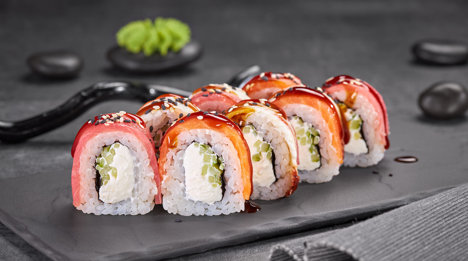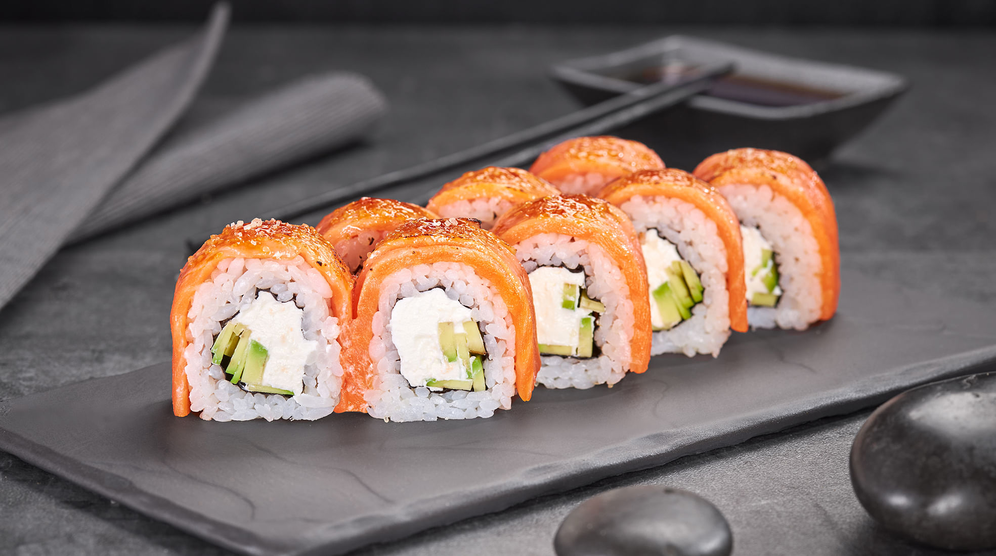 Лосось, угорь, тунец, рис, сыр сливочный "Cremette", свежий огурец, соус унаги, кунжут, водоросли нори