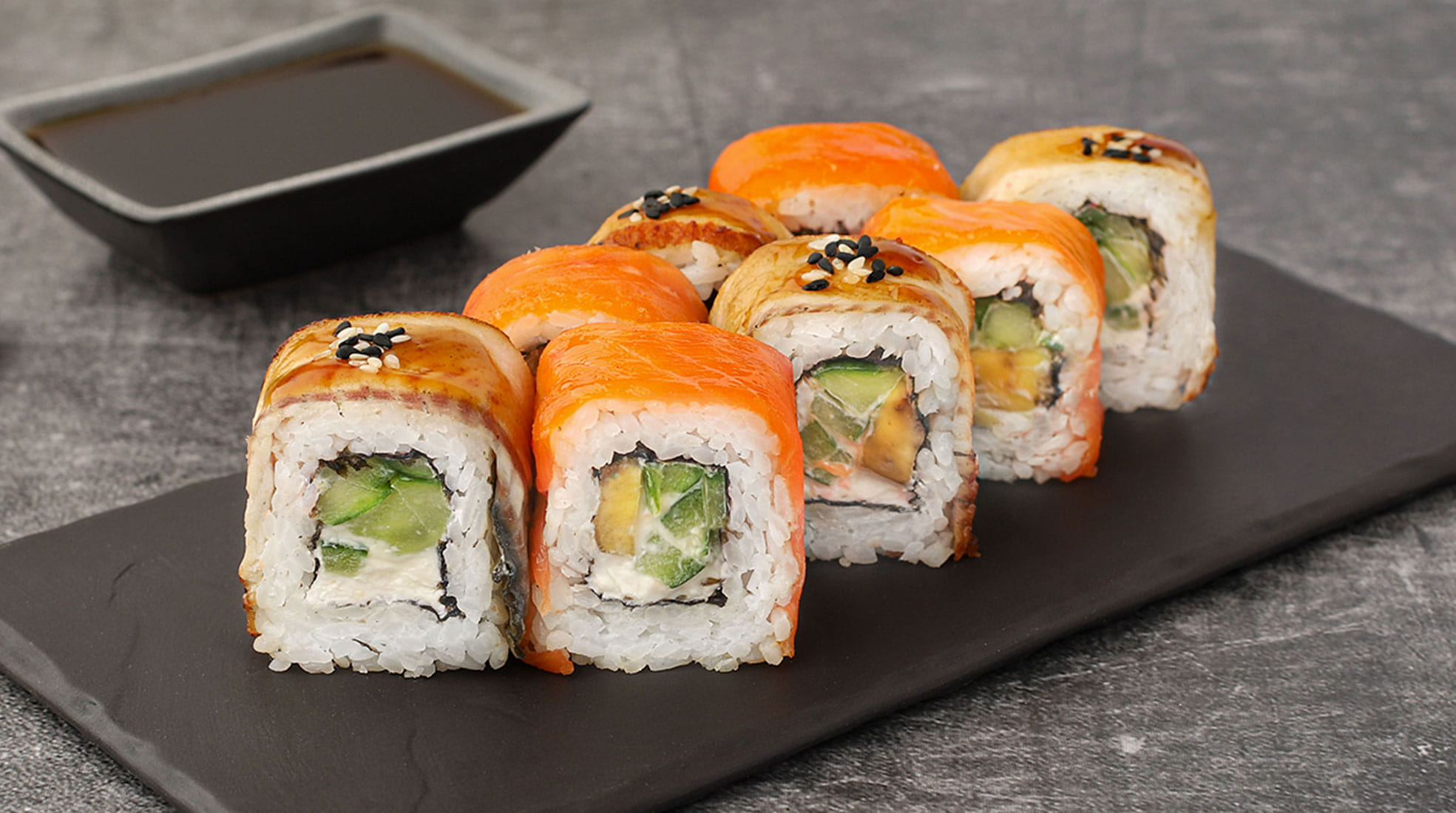 Угорь, краб-микс, рис, соус унаги, свежий огурец, икра масаго, кунжут, водоросли нори