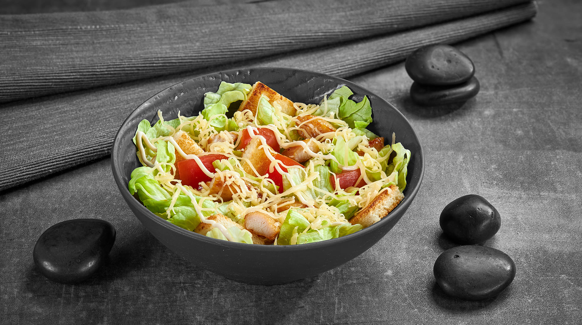 Курица, помидор, капуста пекинская, сыр моцарелла, соус Цезарь, сухари