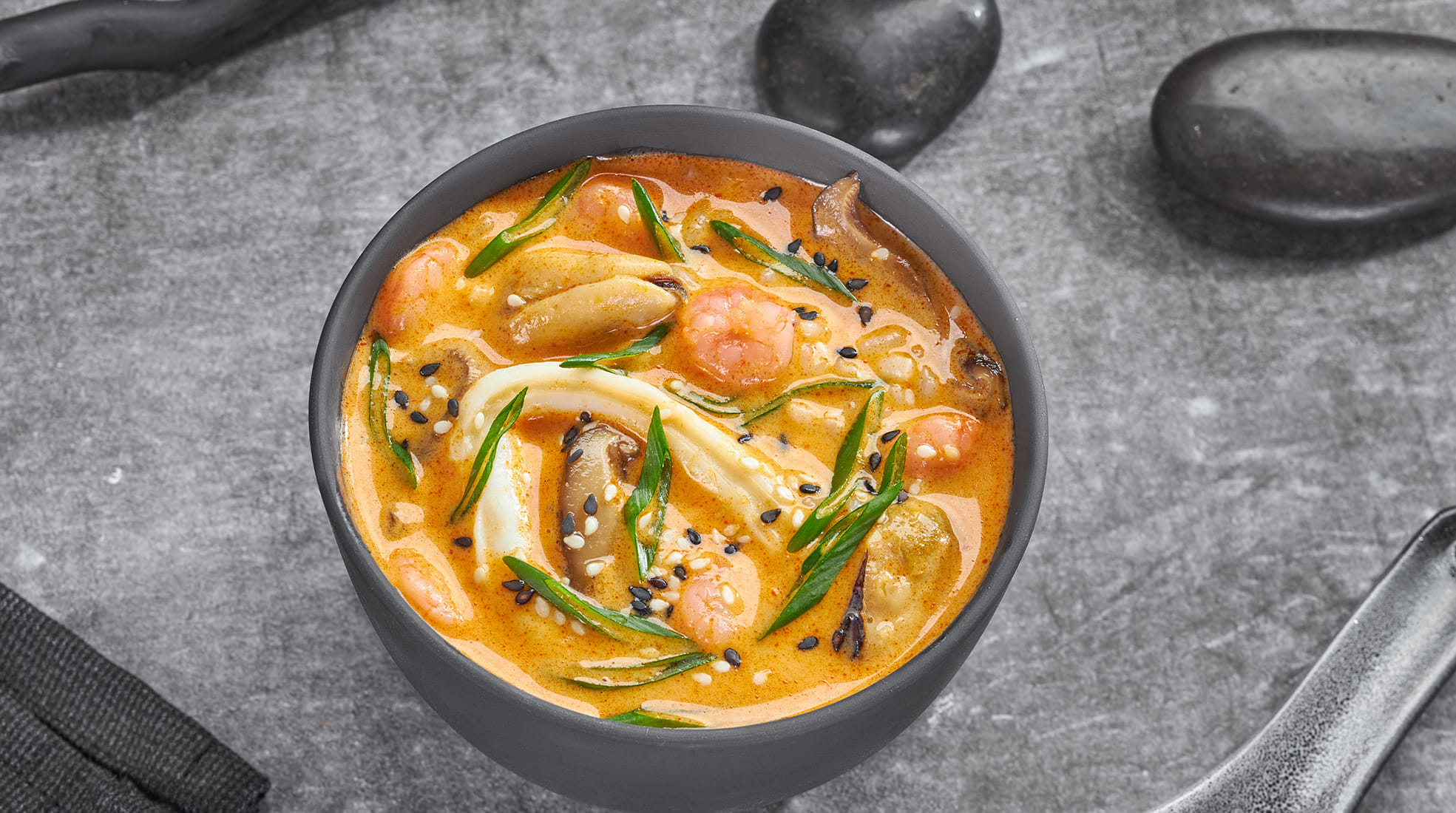 Мидии, кальмар, креветки, бульон Том ям, грибы шиитаке, лук зеленый, кунжут. *Подаётся с порцией риса Гохан.
