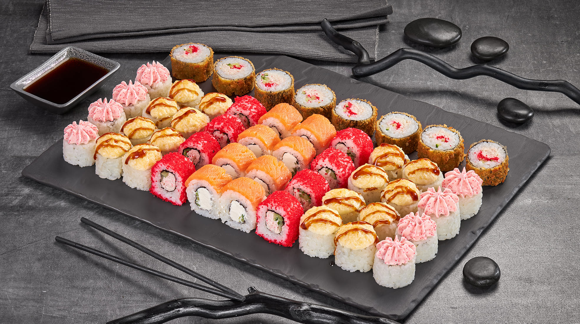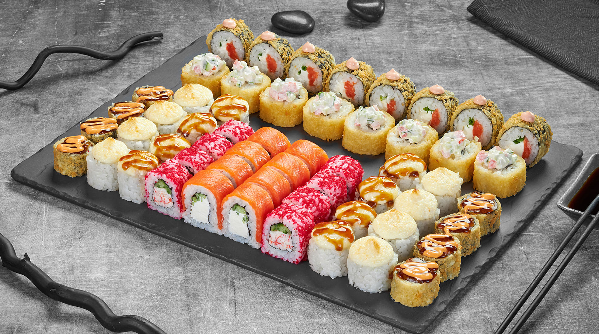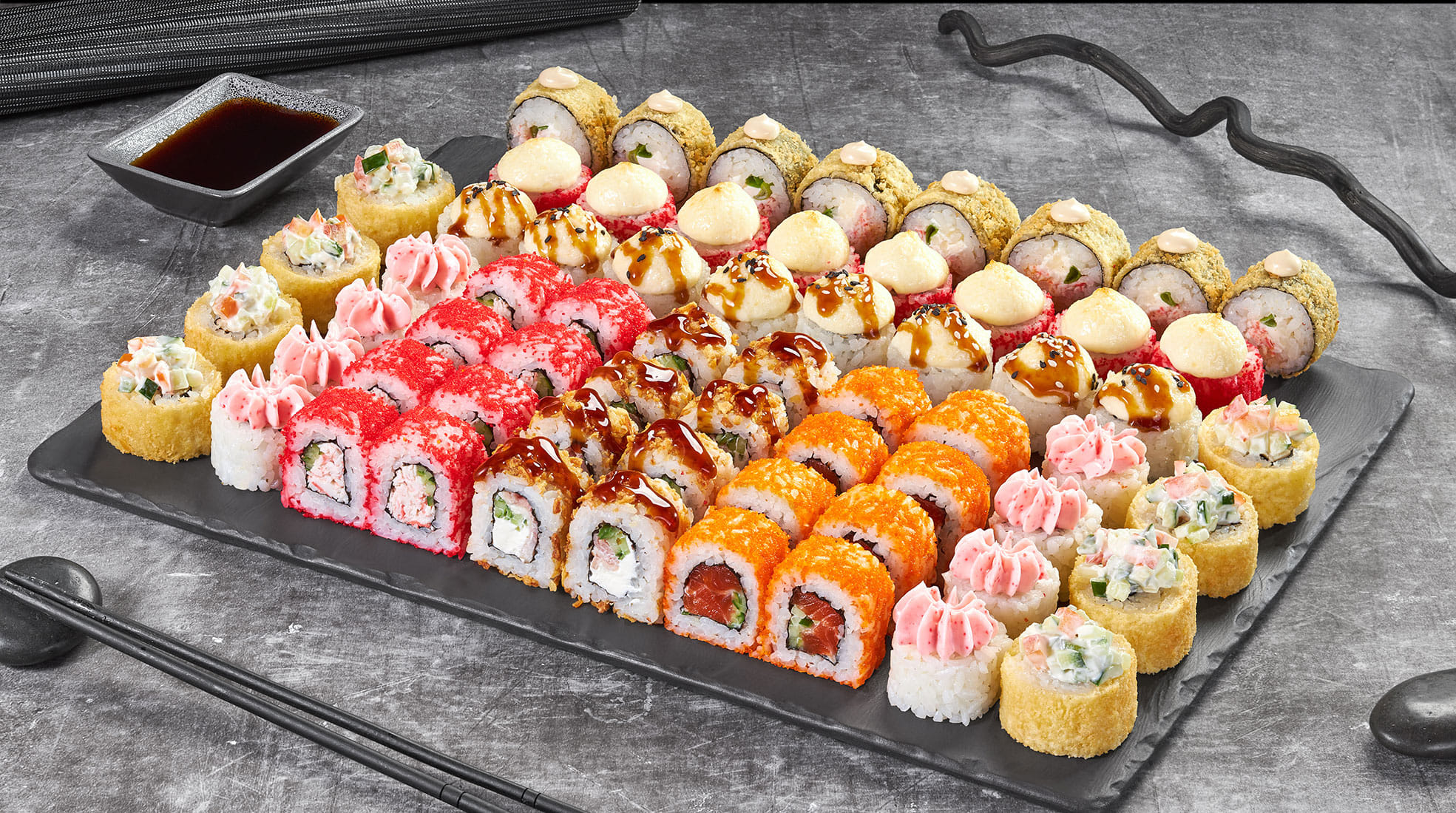 Калифорния сяке с икрой 8 шт, Лава с крабом 8 шт, Калифорния каппа маки в кунжуте 8 шт, Куритос 8 шт, Филадельфия лайт сяке 8 шт, Сакура темпура 8 шт, Краб фри темпура 8 шт, Сяке лайт темпура 8 шт, Нежный с курицей 8 шт, Каппа маки 8 шт. Вес: 1965гр. 80шт.