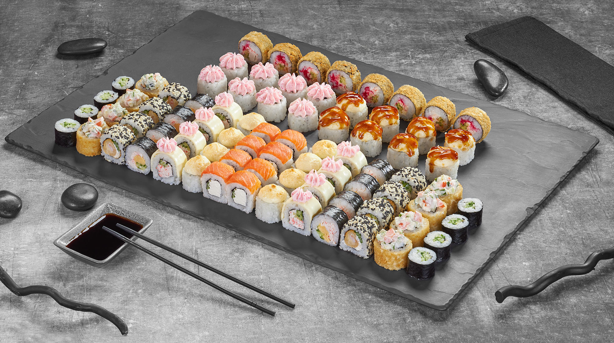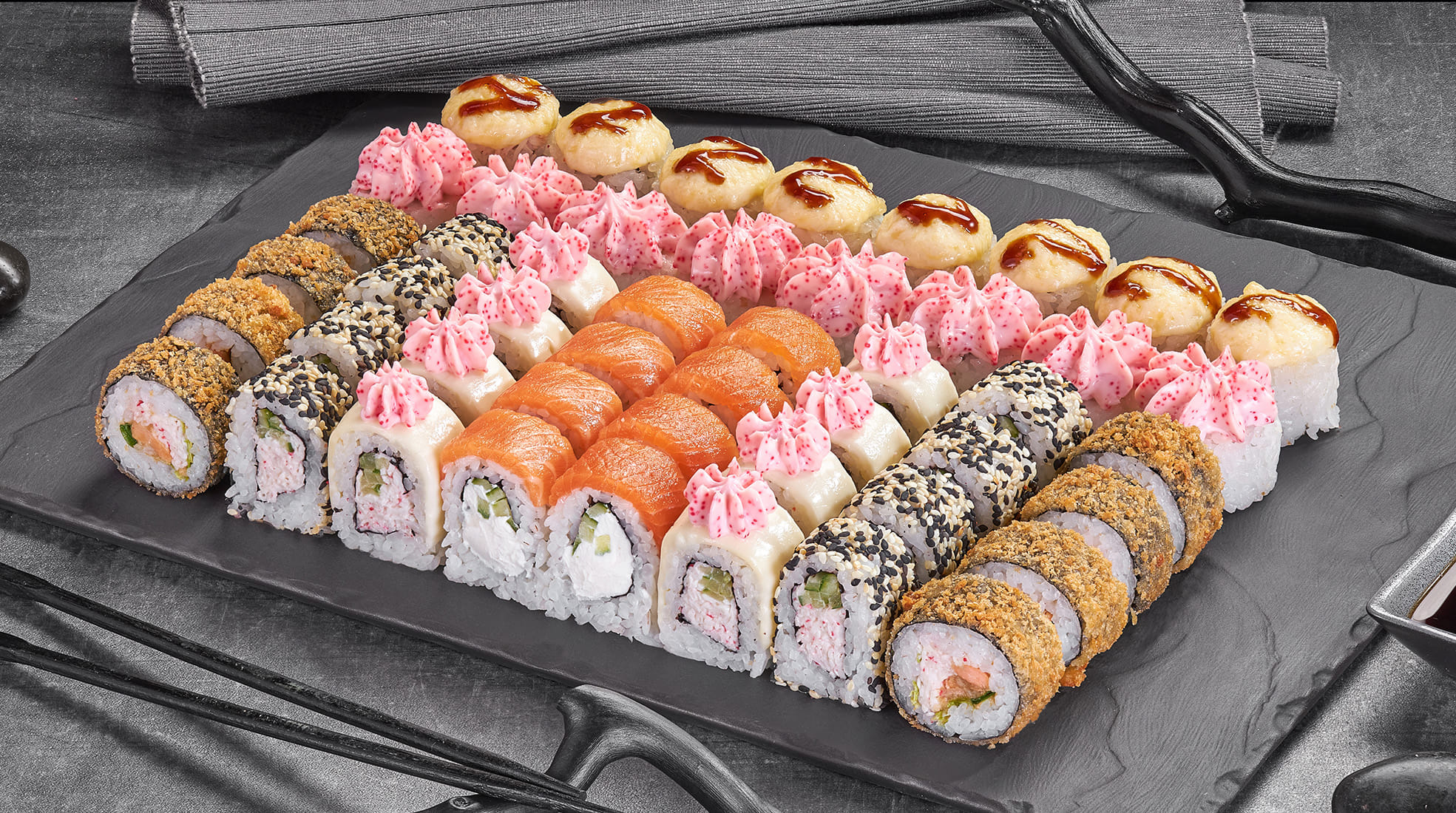 Филадельфия лайт сяке 8 шт, Калифорния каппа маки в кунжуте 8 шт, Лава с лососем 8 шт, Куритос 8 шт, Дон бекон 8 шт, Монако запеченный 8 шт, Нежный с курицей запеченный 8 шт, Калифорния темпура 8 шт, Чебурашка 8 шт, Крабстер 8 шт, Оливье темпура 8 шт. Вес: 2435 гр. 88 шт.