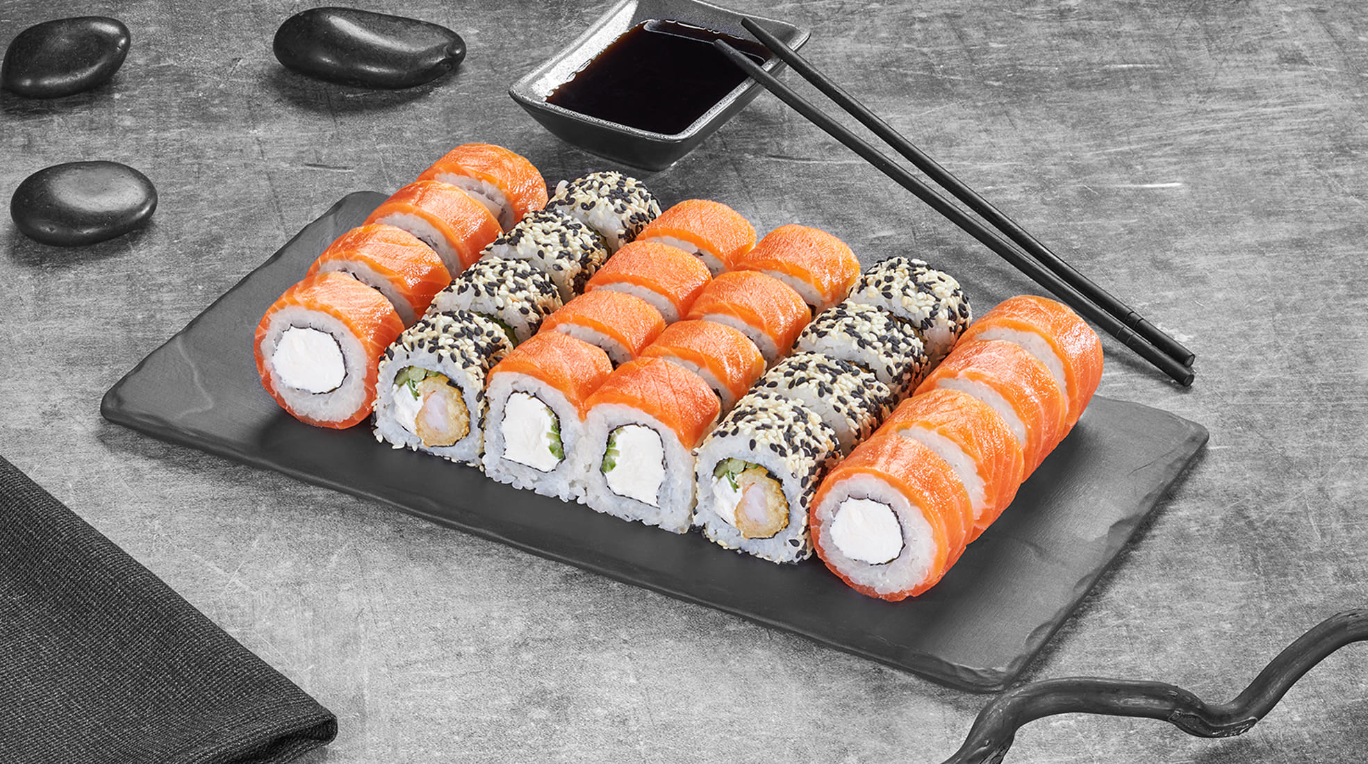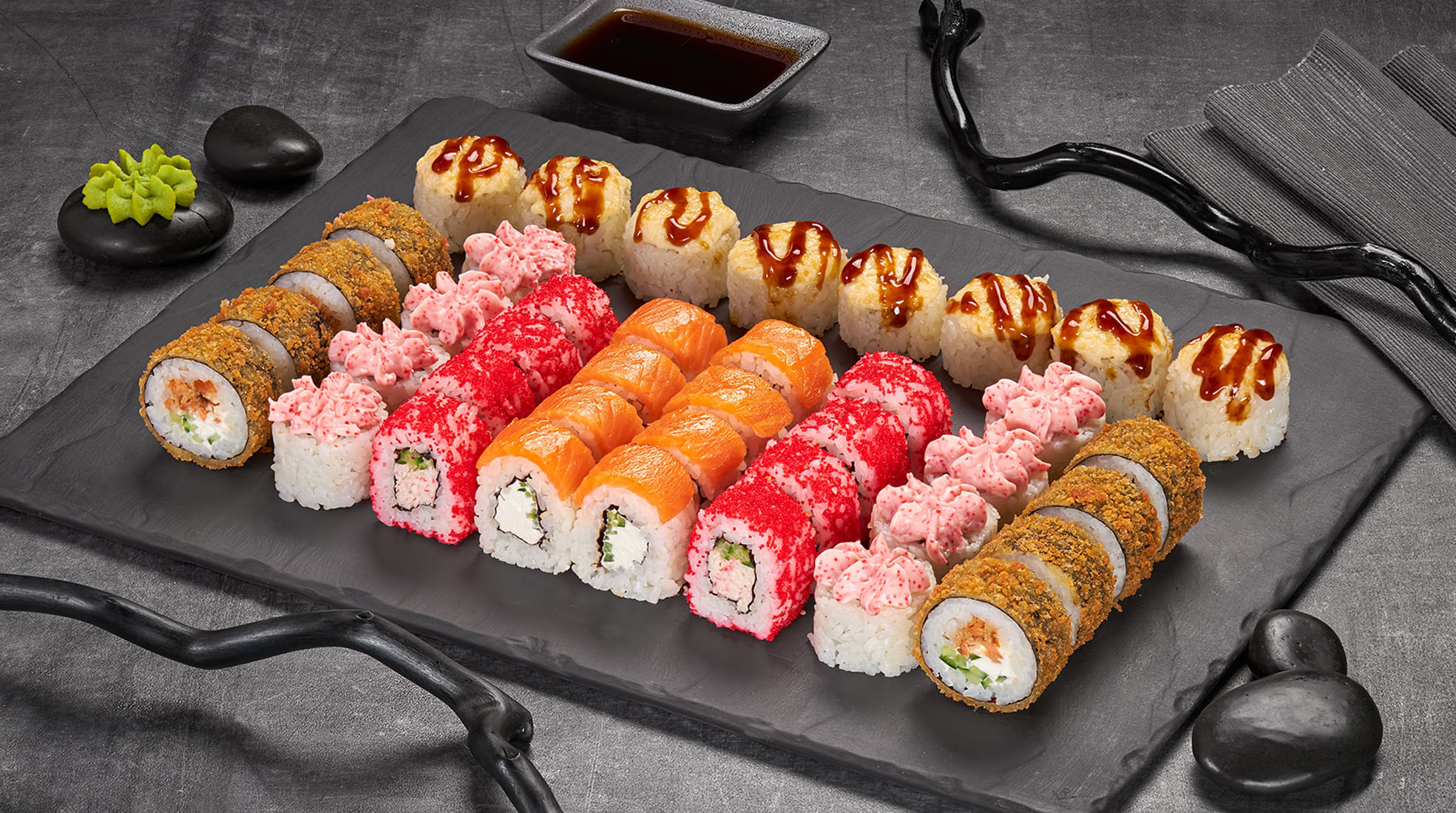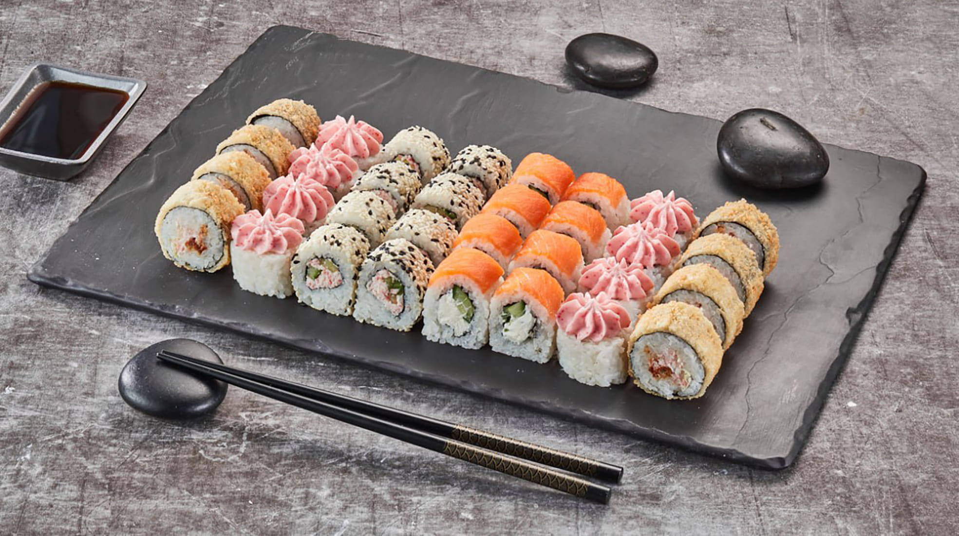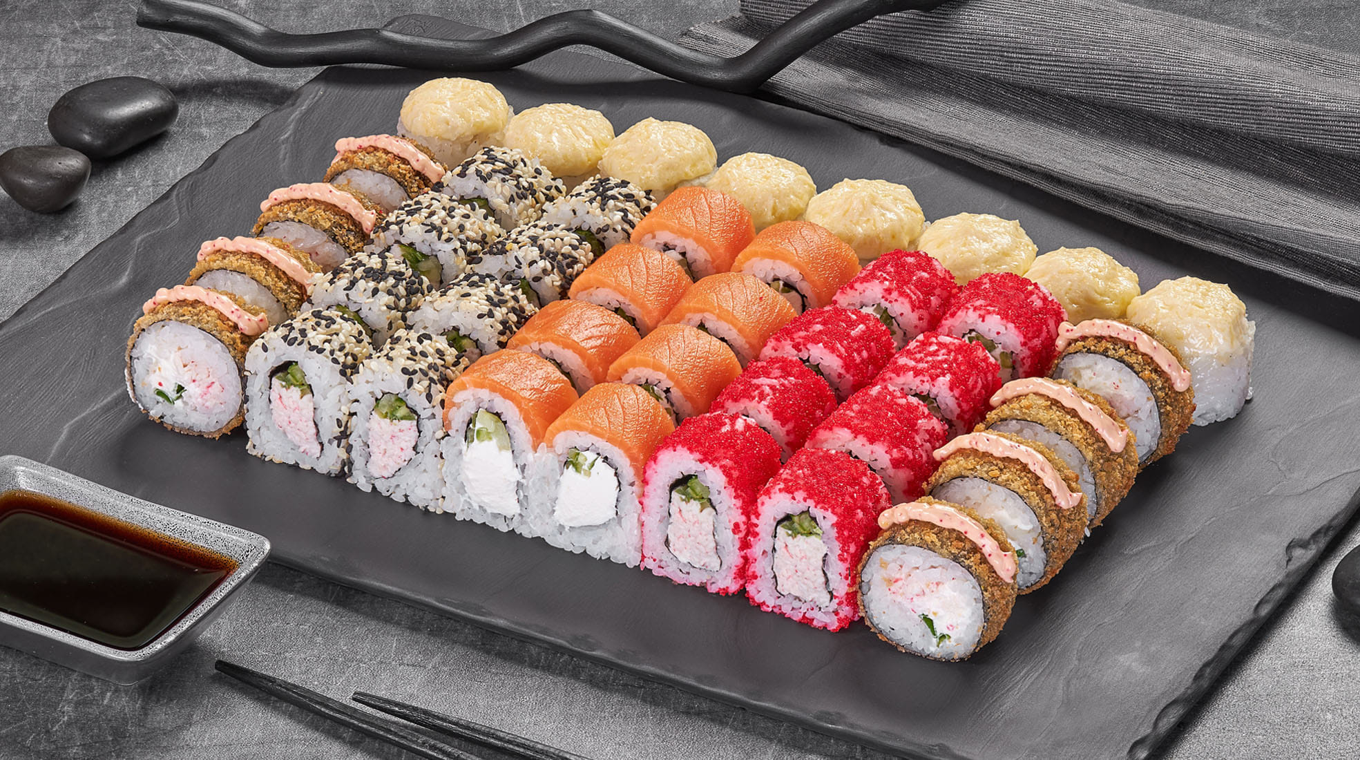 Канадский 8шт, Филадельфия Эби в кунжуте 8шт, Калифорния каппа маки с икрой 8шт, Токио 8шт, Филадельфия темпура 8шт.