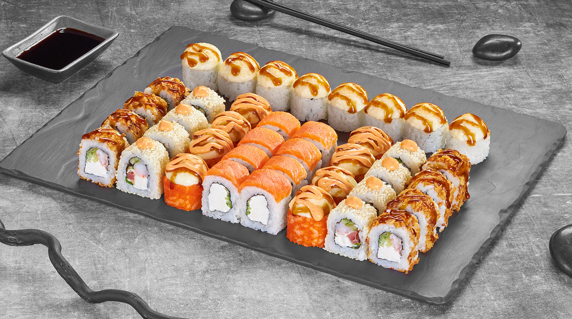 Лава с крабом 8шт, Цезарь ролл запеченный 8 шт, Гранж 8 шт, Филадельфия Эби в кунжуте 8шт, Нежный с лососем запеченный 8шт, Калифорния темпура 8шт, Чеддер 8шт, Каппа маки 8шт, Оливье темпура 8шт, Филадельфия лайт сяке 8шт. Вес: 2110гр. 80шт.